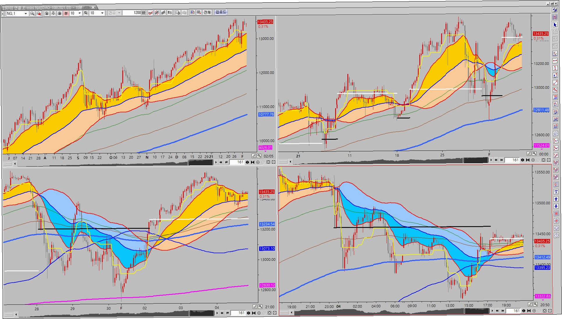 실제 전문 트레이더들의 경우에는 한국시간으로 유럽장이 열리는 16시~17시 사이, 미국 지표들이 주로 발표되는 21시~22시30분에 선물지수를 많이 활용한다고 합니다. 그리고 23시30분 정규장 개장 직후에는 선물의 흐름이 현물의 흐름으로 실제 이어지는지를 한번 더 체크하고요.